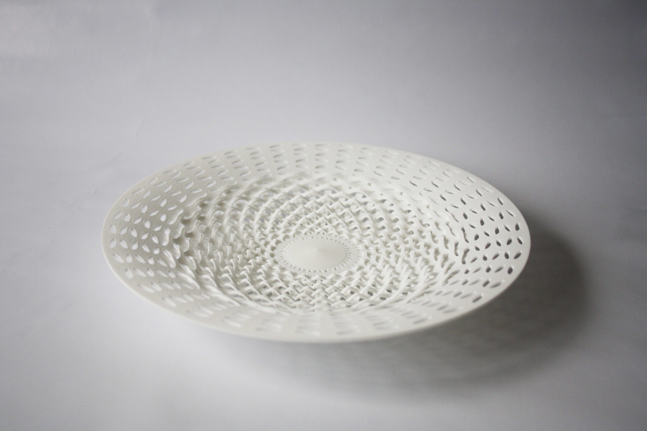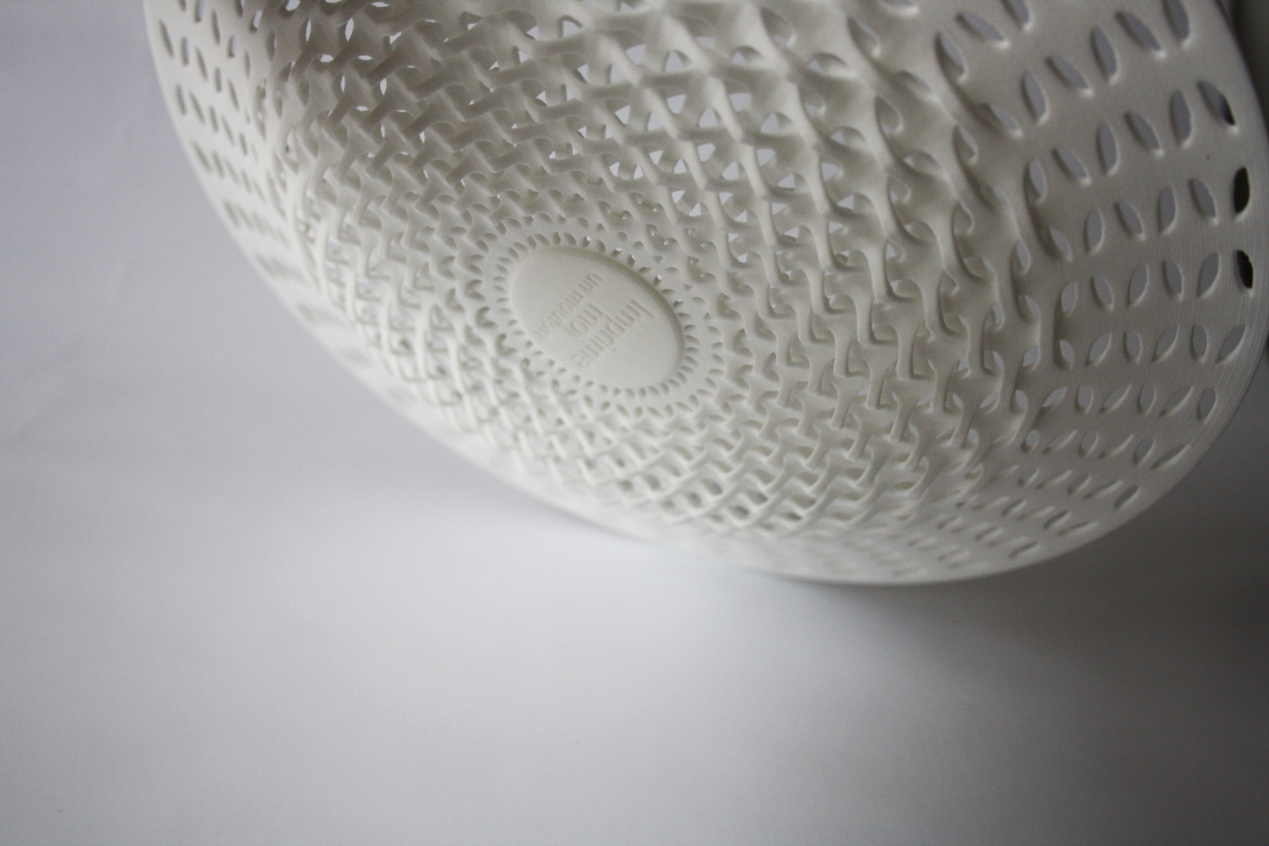 Une texture ajourée avec un motif « pétale » prend forme progressivement, le maillage s’étire de plus en plus et devient un volume. L’entourage de la corbeille est plat puis il prend progressivement forme au milieu. Cette répétition de motifs 2d et 3d crée un ensemble de formes assez complexe qui est impossible à fabriquer autrement qu’en impression 3D. Cette corbeille est très décorative et trouvera facilement sa place dans votre intérieur.