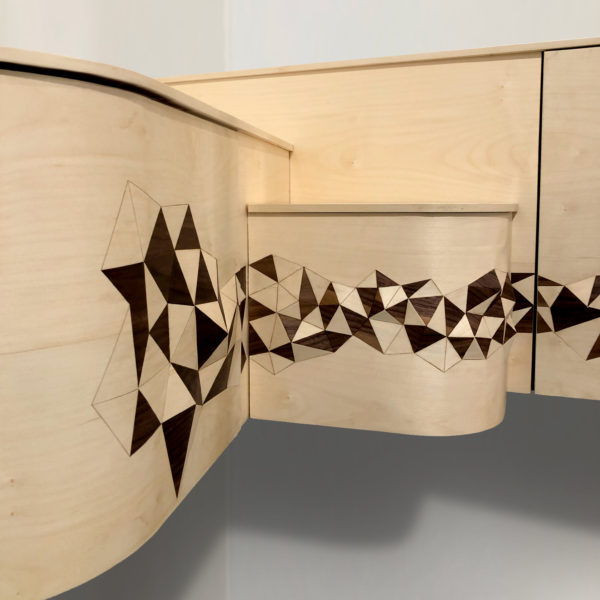Le décor sur ce meuble réinvente l’art de la marqueterie. La modélisation 3D, la découpe numérique et l’impression 3D nous permet ici de repousser les limites de cet artisanat traditionnellement pratiqué à plat. Le motif en placage de bois prend progressivement du relief et prend vie, à l’image de ce savoir-faire en pleine mutation.